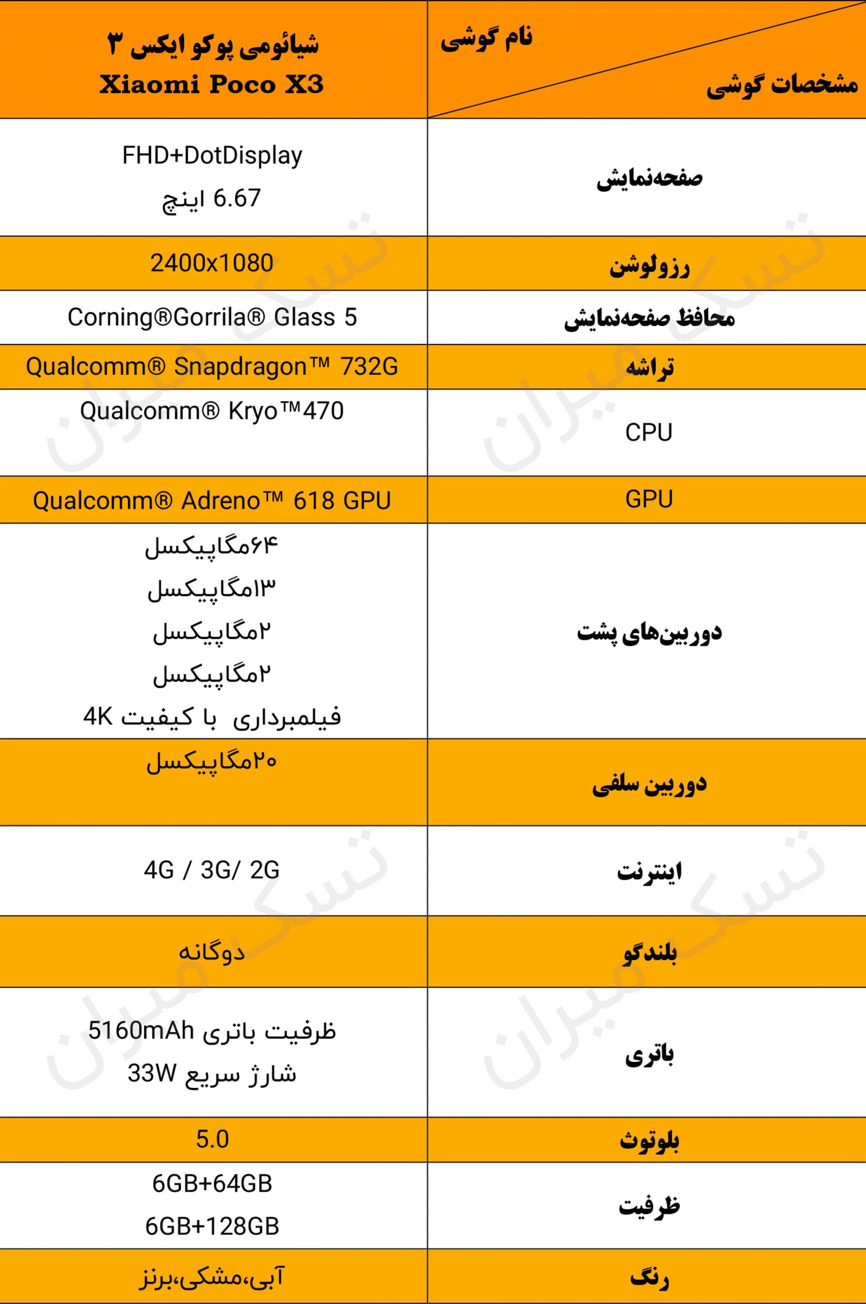 جدول مشخصات گوشی شیائومی پوکو ایکس 3 ان اف سی در یک نگاه
