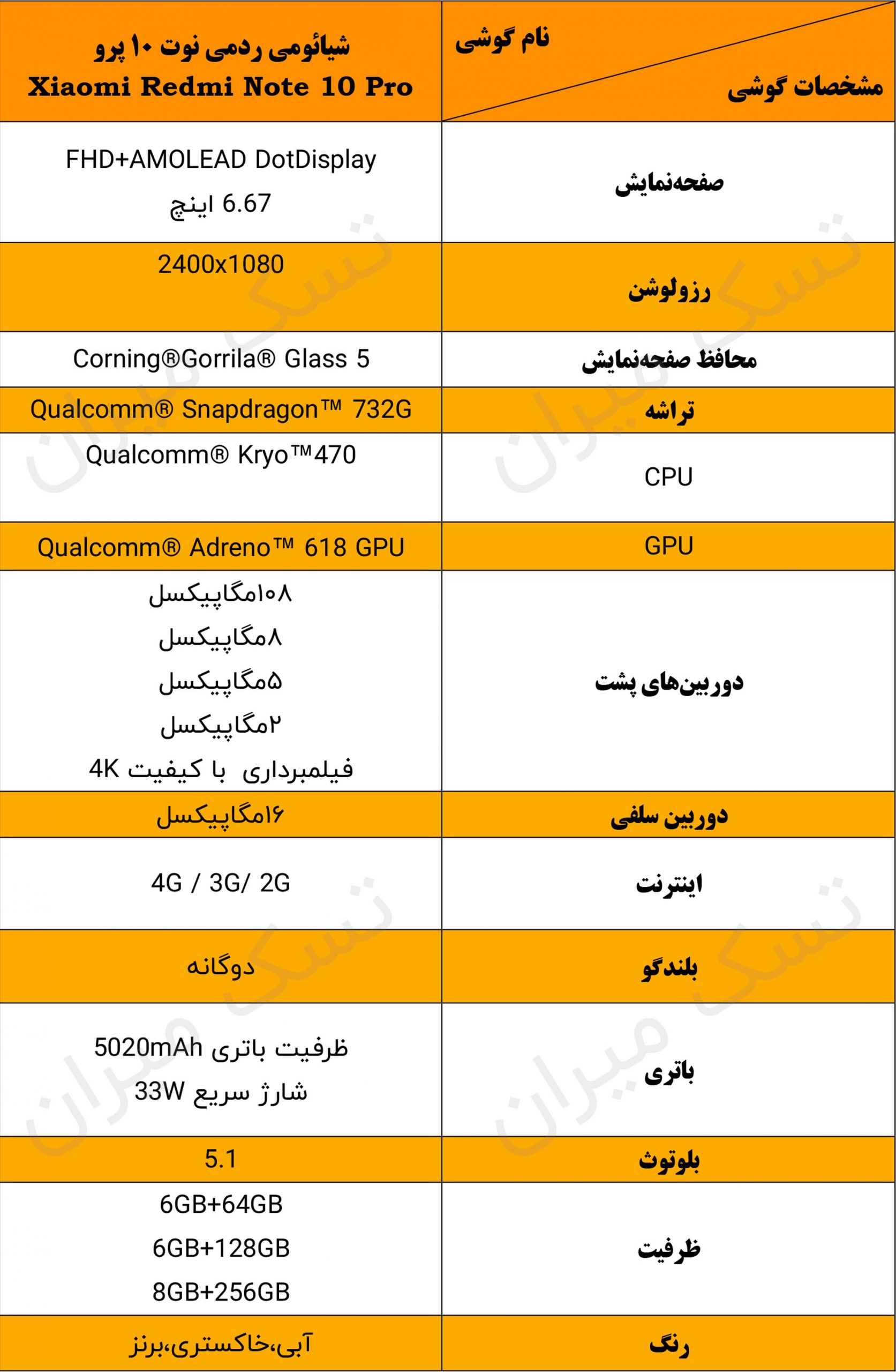 جدول مشخصات گوشی شیائومی ردمی نوت 10 پرو در یک نگاه