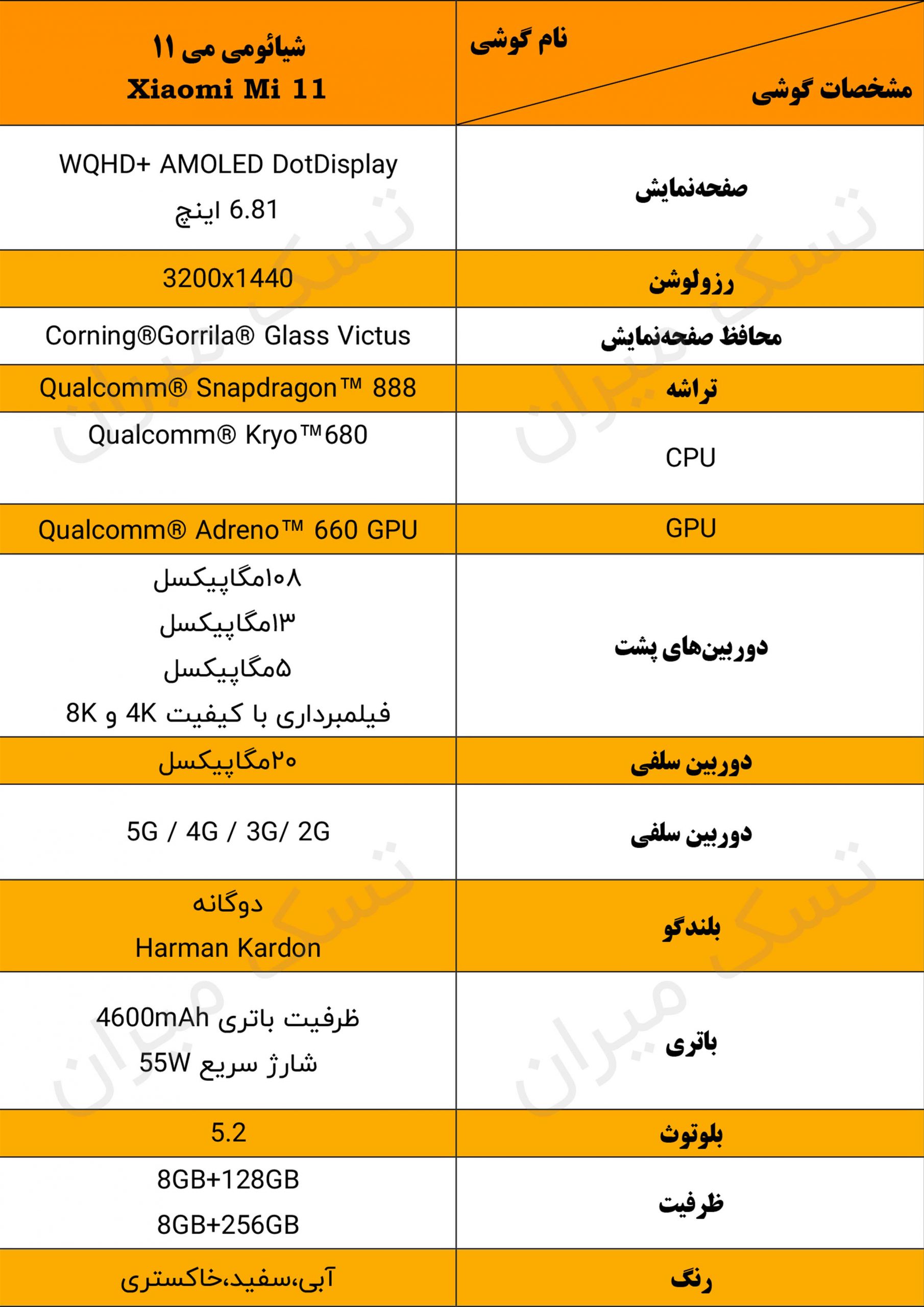 جدول مشخصات گوشی شیائومی می 11 در یک نگاه