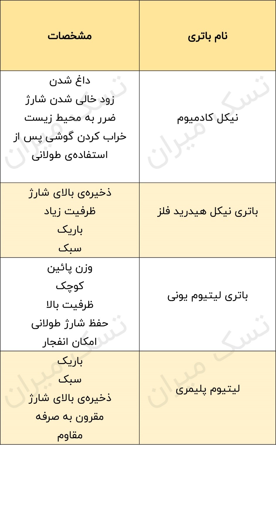 جدول ویژگیهای باتریهای گوشیهای موبایل