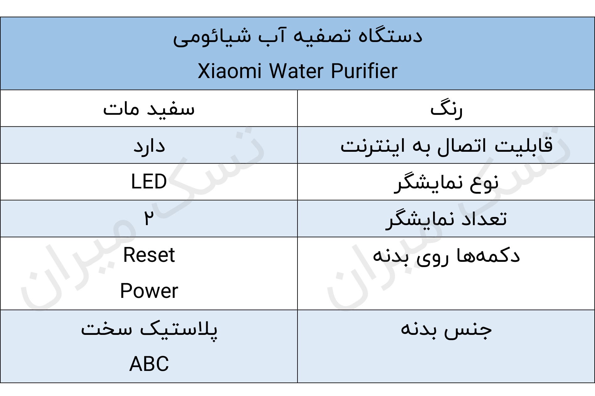 جدول مشخصات دستگاه تصفیه آب شیائومی