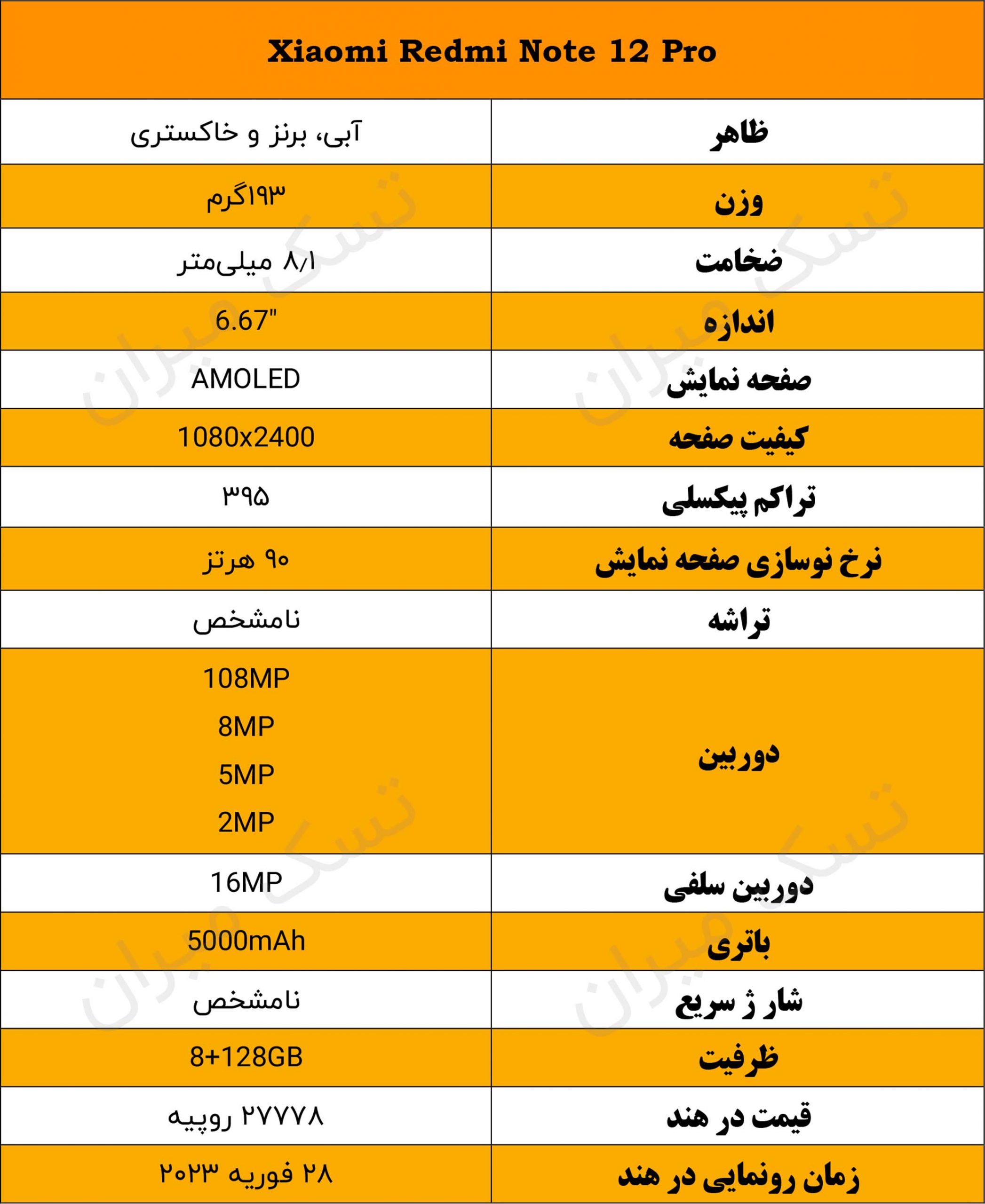جدول مشخصات احتمالی گوشی شیائومی Redmi Note 12 Pro