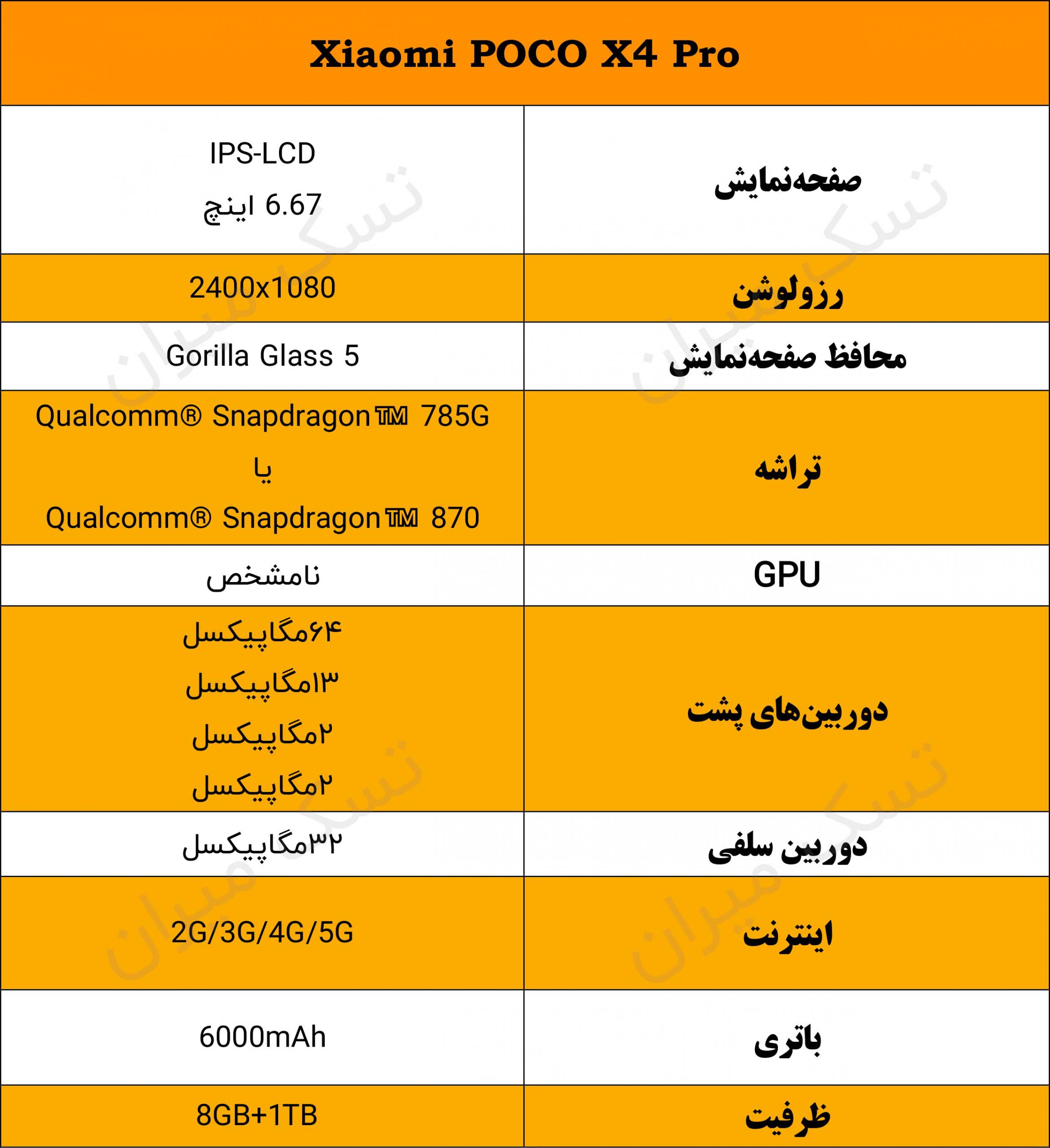 جدول مشخصات گوشی شیائومی پوکو ایکس 4 پرو