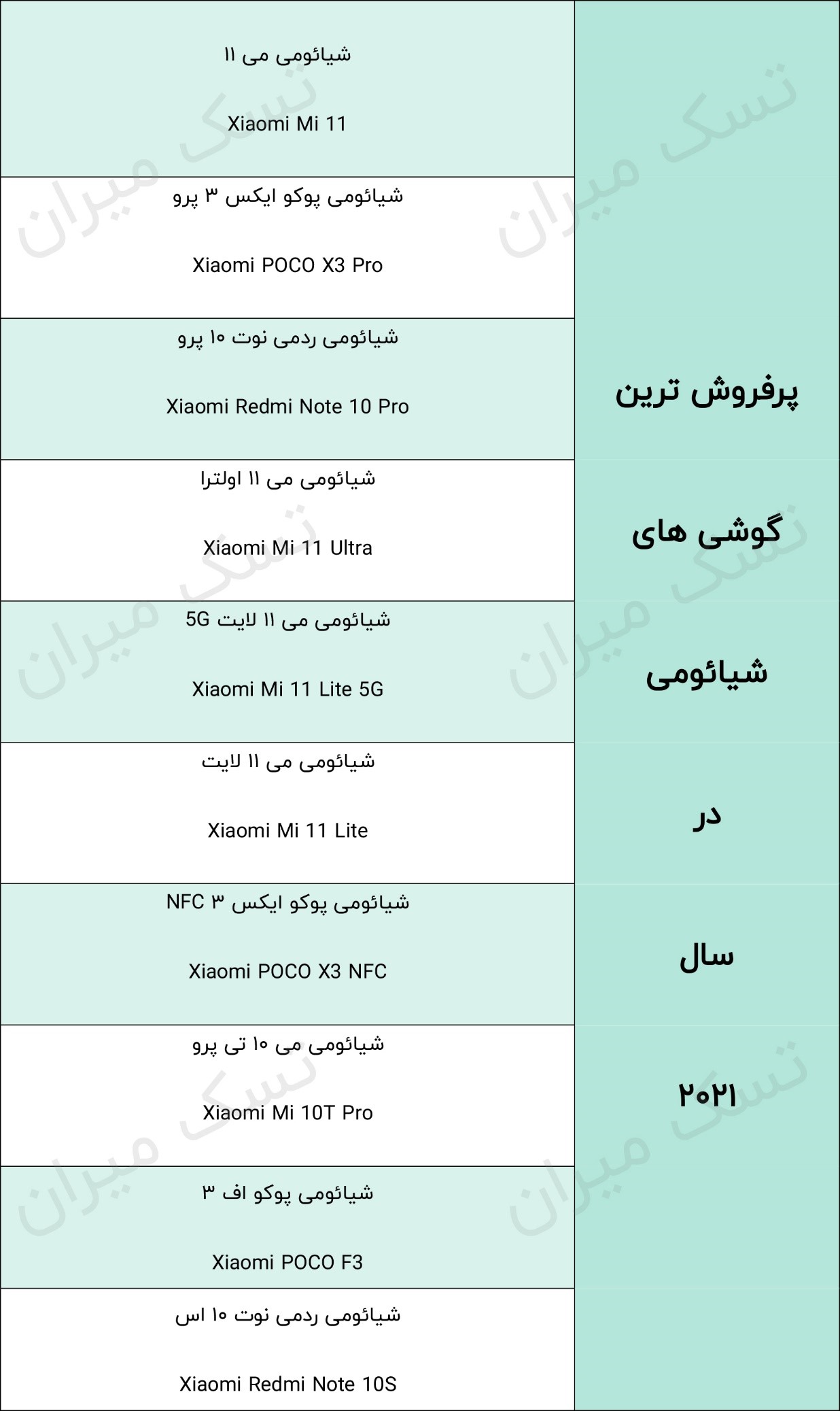 اما بهترین گوشی های شیائومی بنا بر قیمت، کاربرد و امکانات و نیز خدمات پس از فروش از دید هر کس تفاوت دارند. با توجه به آخرین اطلاعات به دست آمده در تاریخ 18 آگوست 2021، لیست پر فروش ترین گوشی شیائومی در سال 2021 که نشان از دیدگاه مشترکی میان کاربران دارد، از این قرار هستند: