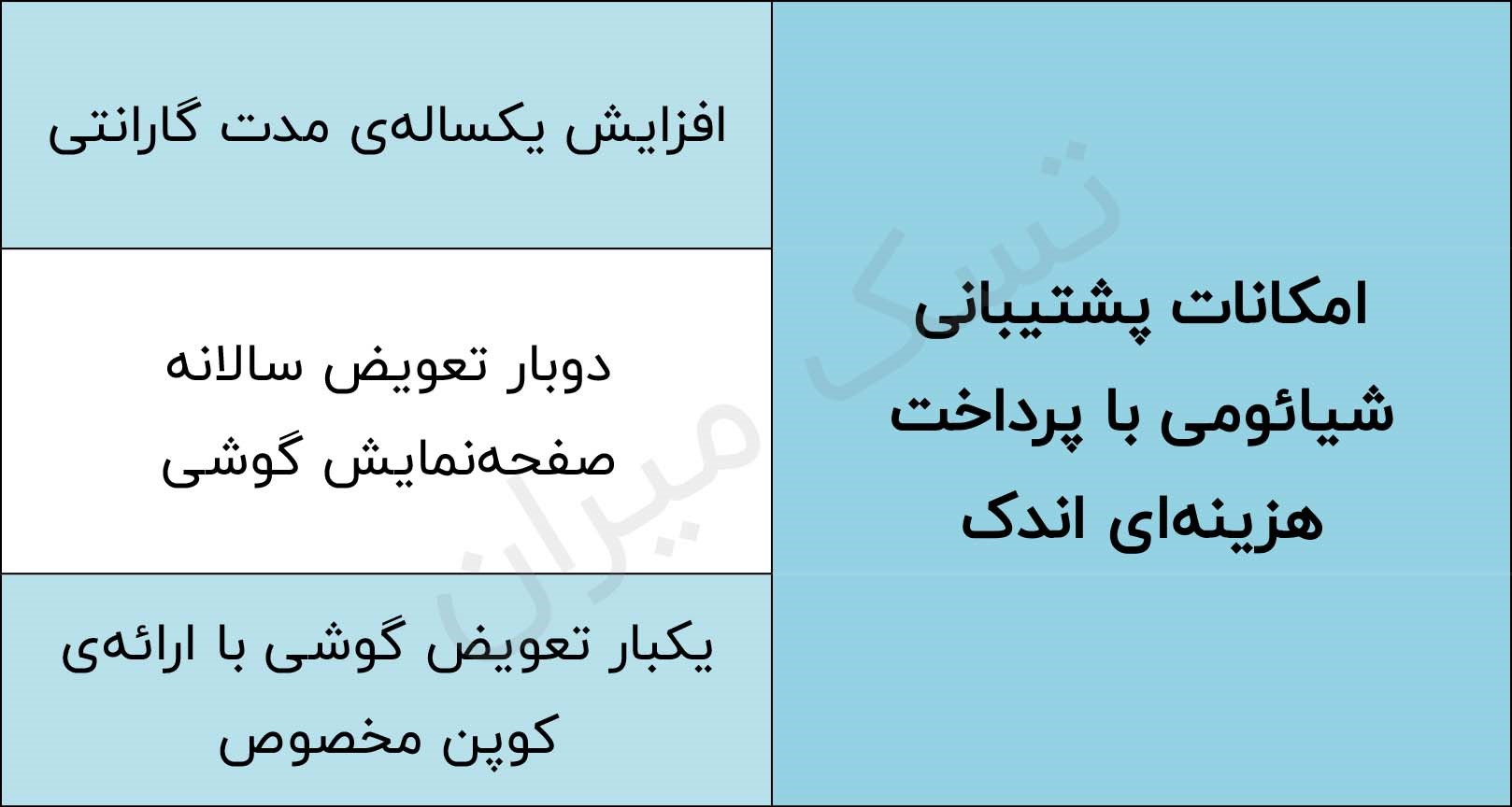 بخشی از خدماتی که تنها با پرداخت مبغی اندک، در چین و به زودی برای خریداران موبایل با گارانتی گوشی شیائومی در اروپا در دسترس خواهد بود، در جدول زیر آمده است