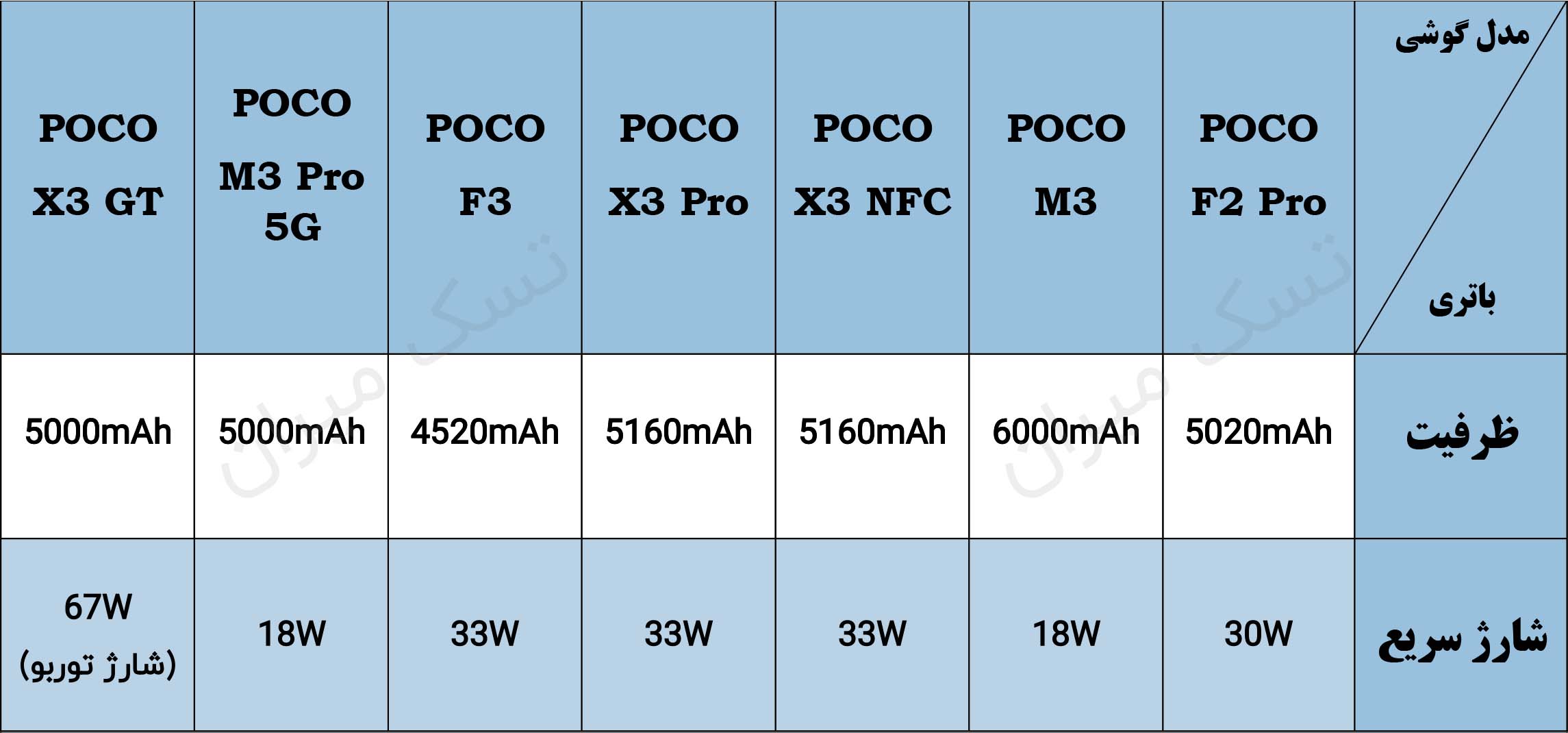 جدول مشخصات باتری گوشی های پوکو