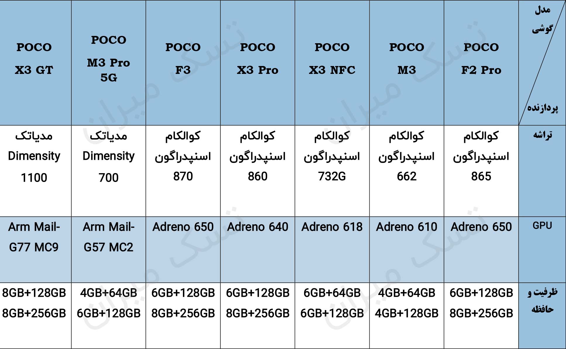 جدول مشخصات تراشه و ظرفیت گوشی های پوکو