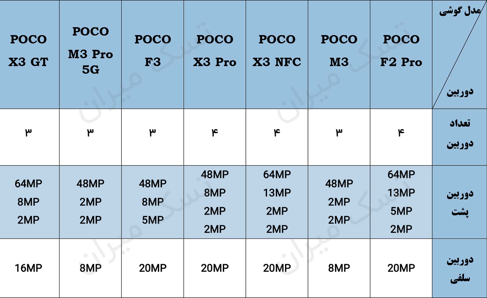 جدول مشخصات دوربین گوشی های پوکو