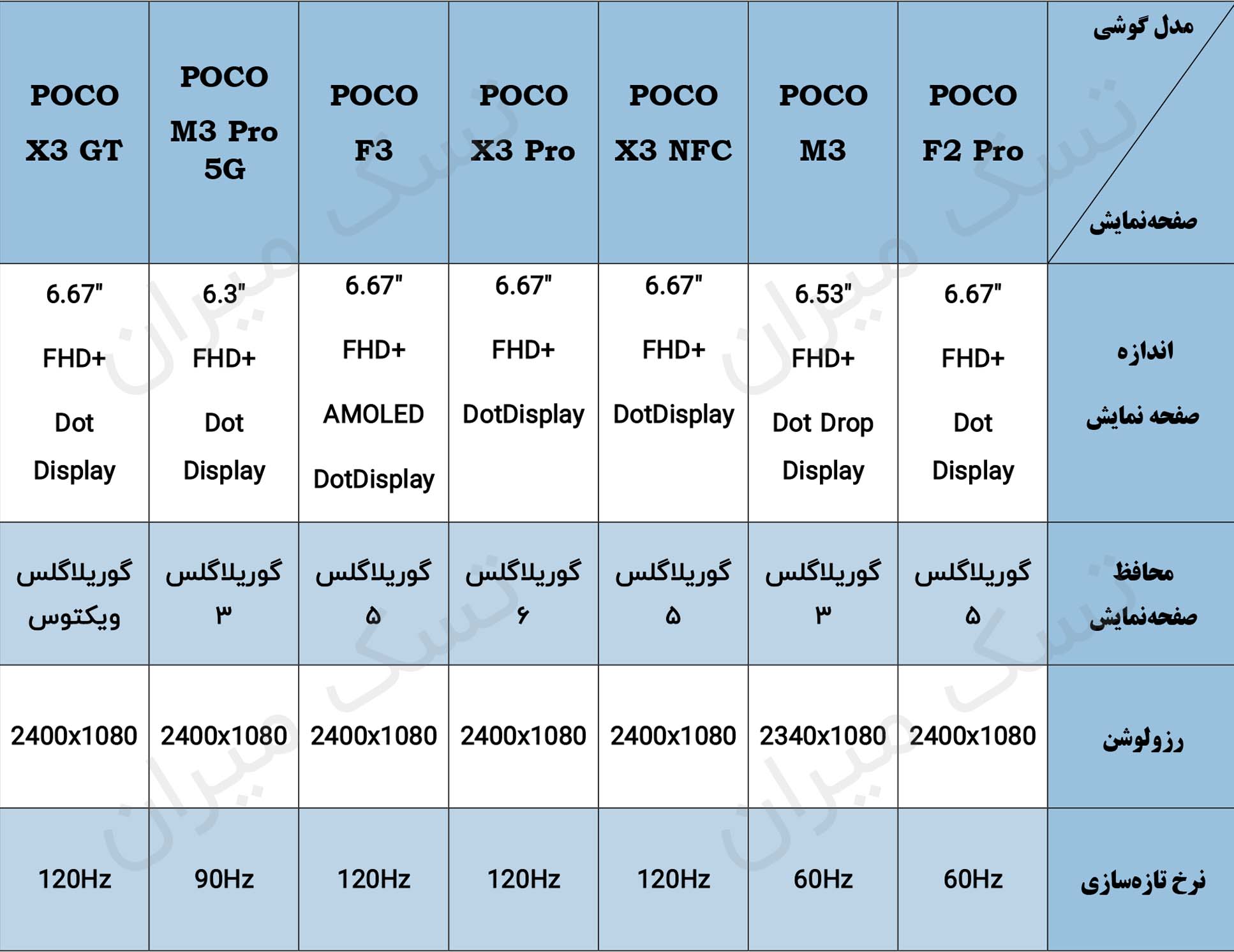 جدول مشخصات صفحه نمایش گوشی های پوکو
